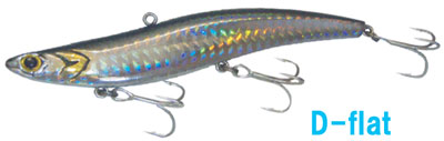 D−フラットはベイエリア 河川のシーバスだけでなく サーフのフラットフィッシュ(ヒラメ マゴチ)もターゲットとし考え開発されたローリング系バイブレーションです。細身のシルエットはよりナチュラルにベ イトと同化し、テールの断面はVカットデザインにより、泳ぎの際テールを下にさげヘッド底重心でありながら水平近くまでナチュラルなスイミング姿勢を保つ よう設計されています。